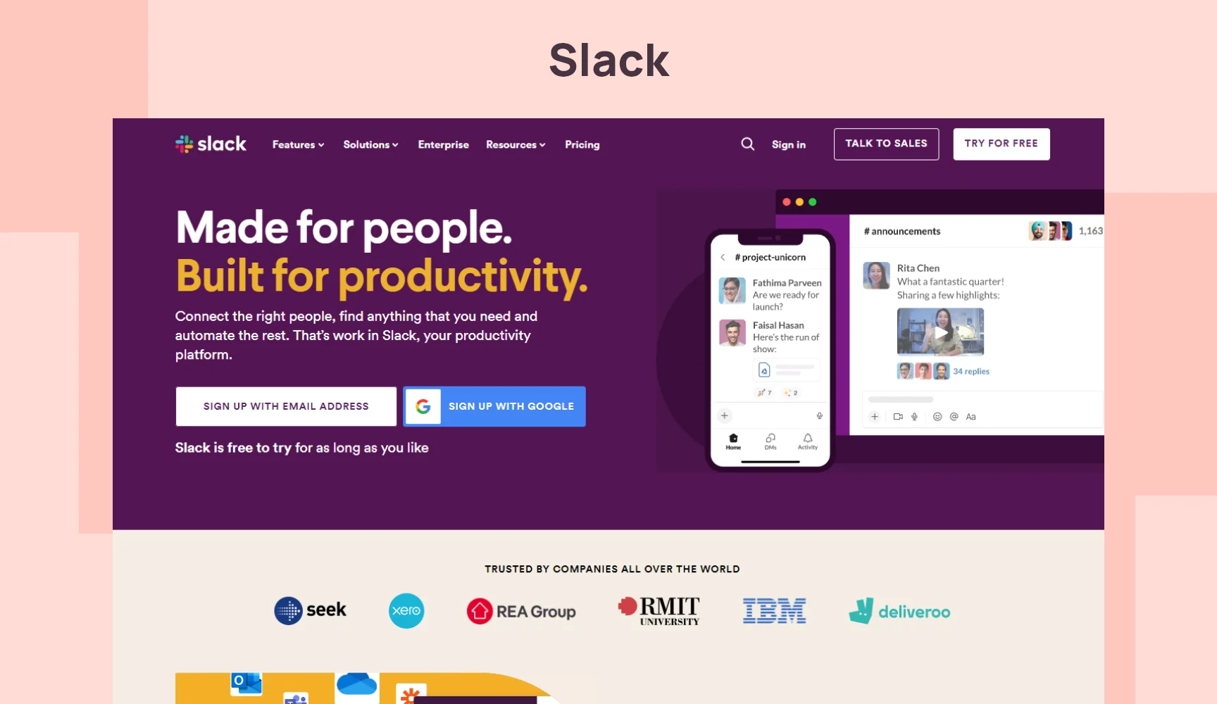 The app enhances the connectivity and productivity of any company through features like direct messaging, file sharing and integration of numerous external tools for seamless workflow management.
