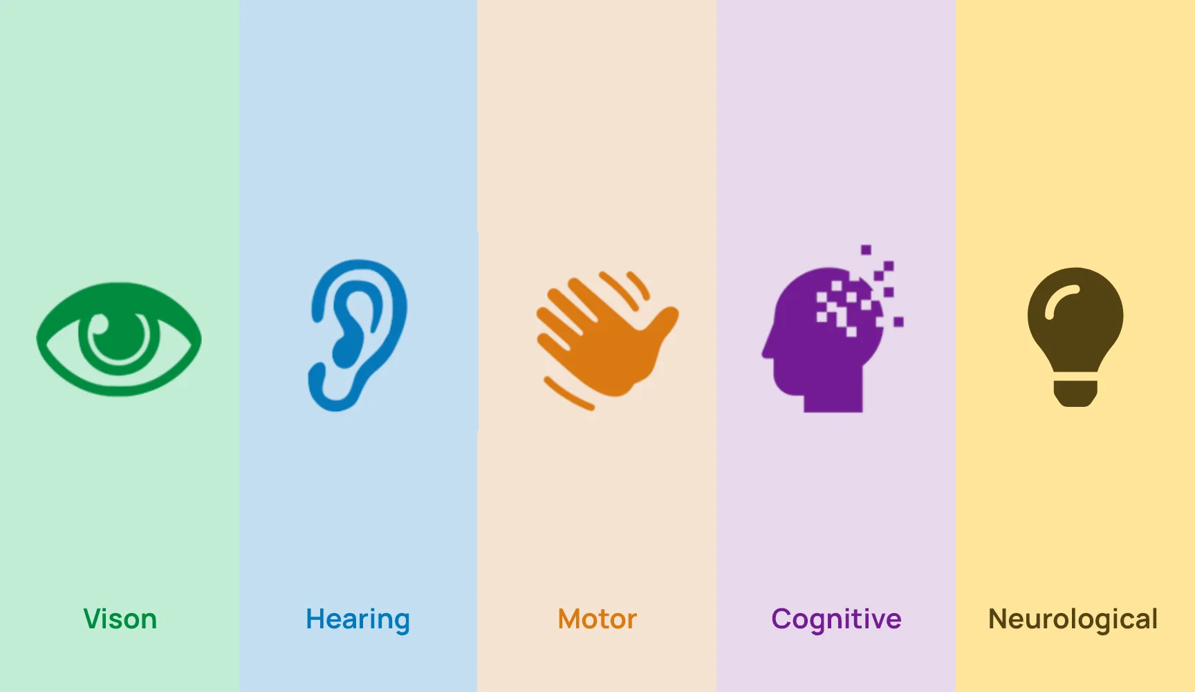 There are numerous visual, hearing and cognitive impairments that individuals suffer from. Here are the 5 major disabilities that cover all impairments: